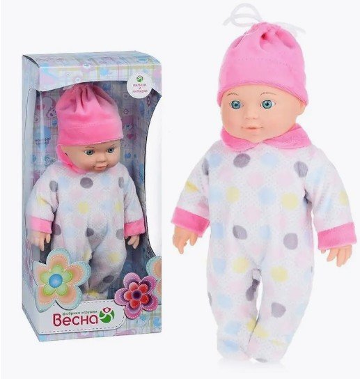 Кукла Весна Малышка Пятнышко (В3934). Малышка Пятнышко - образ младенца - девочки с милым личиком и пухленькими щёчками. Ребёнку захочется взять малышку себе на ручки и позаботиться о ней. Малышка в велюровом костюмчике любит тепло и уют, ребёнку будет комфортно обнимать ее, играть и спать с ней. В комплект одежды входит: комбинезон и шапочка из велюра.