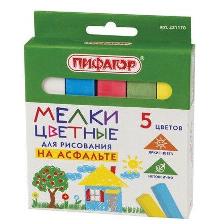 - Мел для рисования на асфальте 5 штук, цветной квадратный, ПИФАГОР, картонная уп., европодвес, 221170